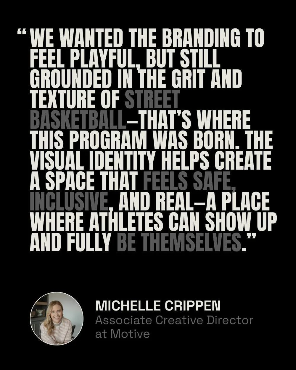 Motive Team: Matt Statman, Founder/CEO | Mathew Proctor, CD | Meredith Rowe, ACD | Sidney Pinger, Designer | Kelsey Ruggaard, Designer | Nolan Addison, Production Designer | Deirdre Lafferty • Vernon Walker • Connor Kreidle • Derrick Gomez • Andrew Rockman •Abby Wietro • Grace Sullivan, Brand Experience